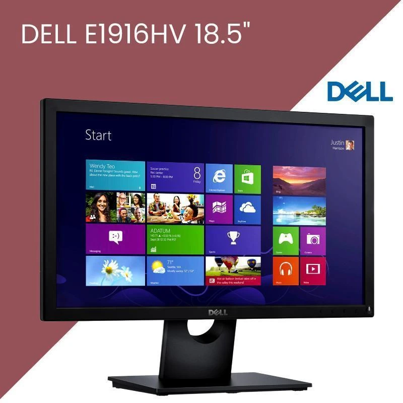 Écran Dell E1916HV. Taille 18.5 pouces. Résolution HD (1366 x 768). Dalle TN. Taux de rafraîchissement 60 Hz. Connectivité VGA. Inclinaison ajustable. Faible consommation d’énergie. Design compact pour espaces réduits.