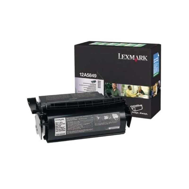 Toner Lexmark 12A5849. Noir. Haute capacité. Rendement 25 000 pages. Version Return Programme (cartouche à retour écologique). Spécial étiquettes. Compatible imprimantes Lexmark Optra T.